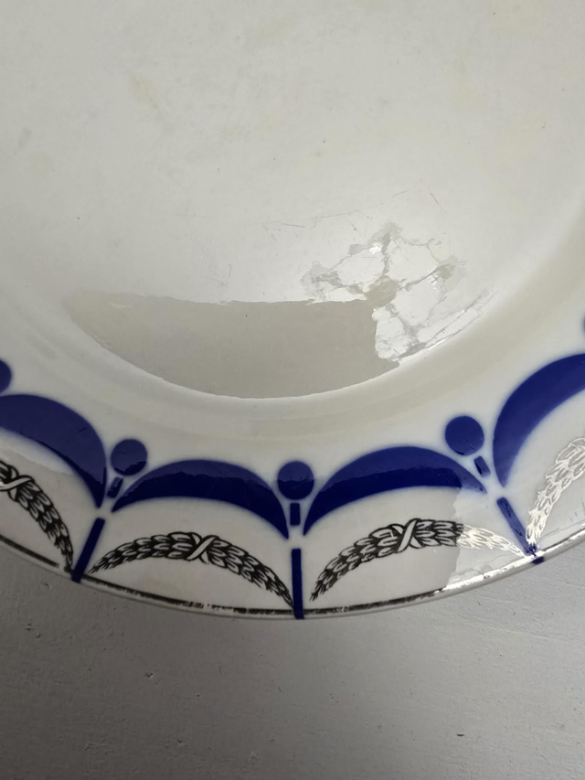 Très bon état malgré un petit éclat en dessous, infimes traces d'usures et manques de dorure.
